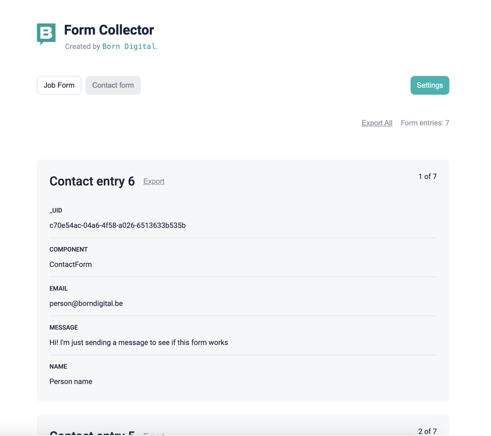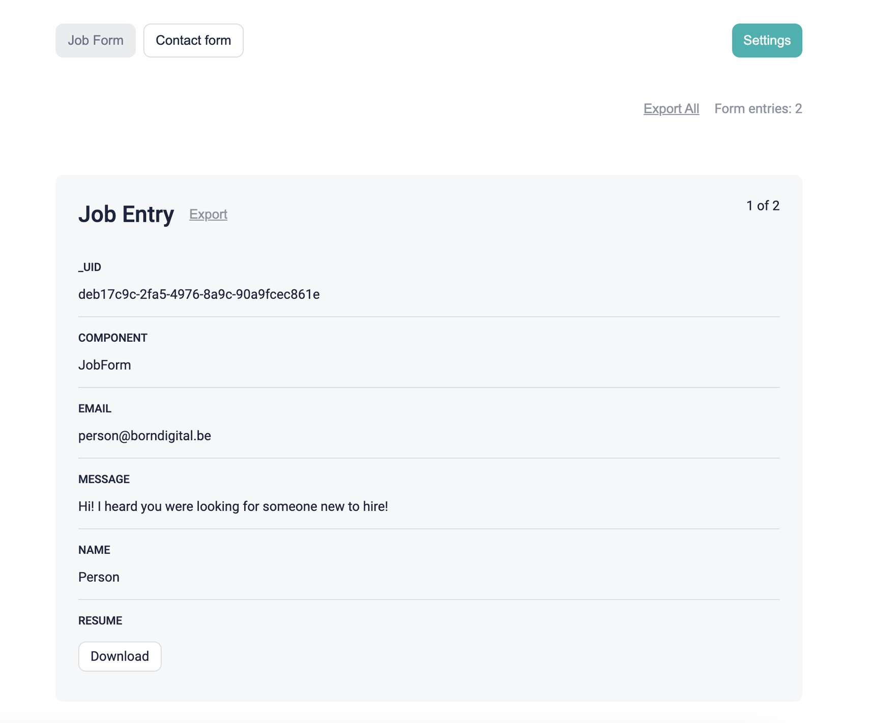 }Later, we will add an 'export all' button at the top. This button will loop over all form entries, format them into a large JSON file, and convert that into a larger .csv file for easier use.